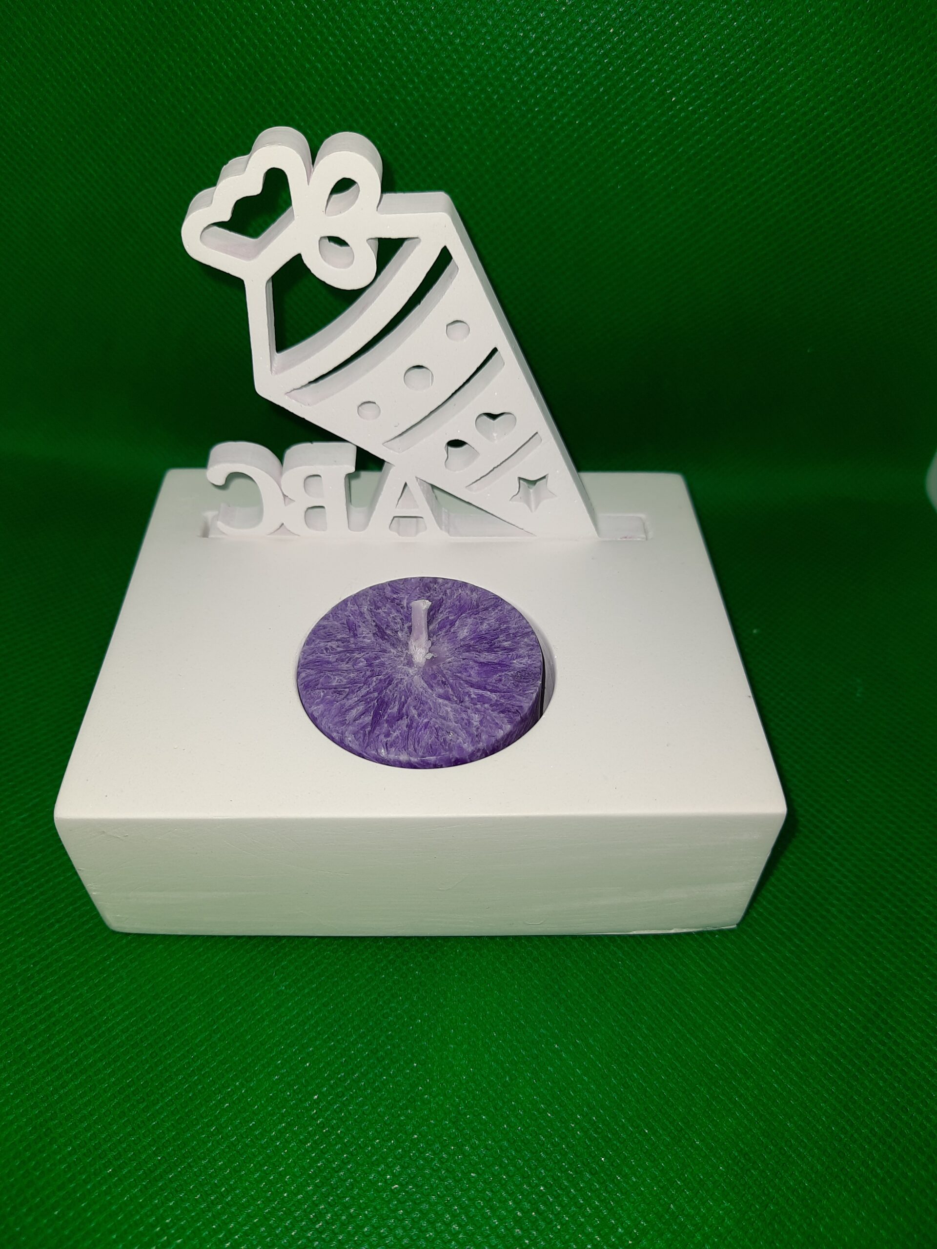 Dieses Set besteht aus der Basis mit der Aussparung für ein Teelicht und einem personalisiertem Klötzchen sowie dem Einschieber „Schultüte“.